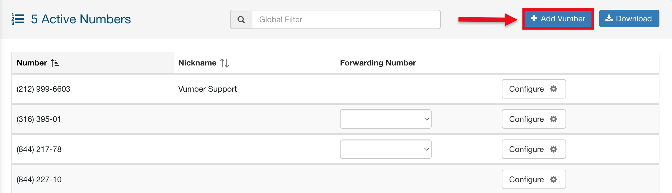 To add a new Vumber through the portal dashboard, follow these steps: