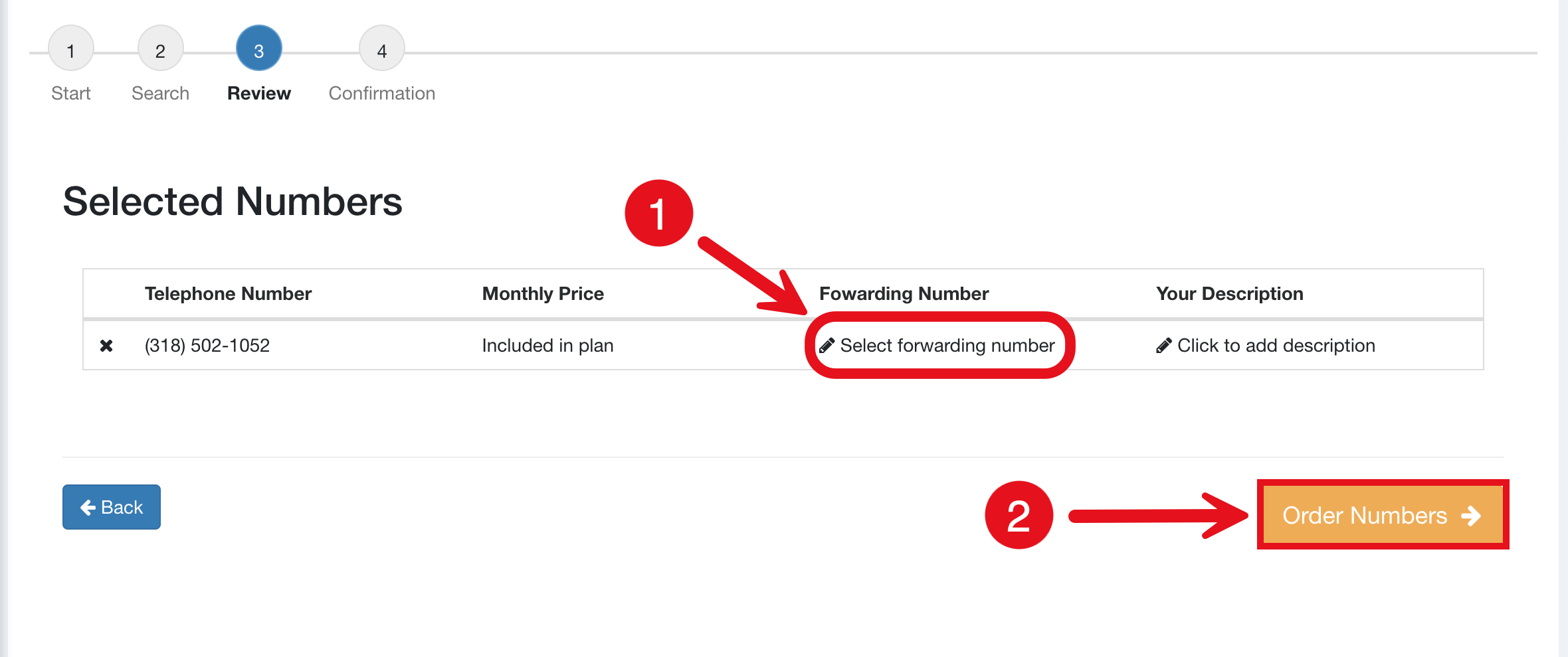 - After selecting the forwarding number, hit the "Order Numbers" button located in the orange box to finalize your selection.