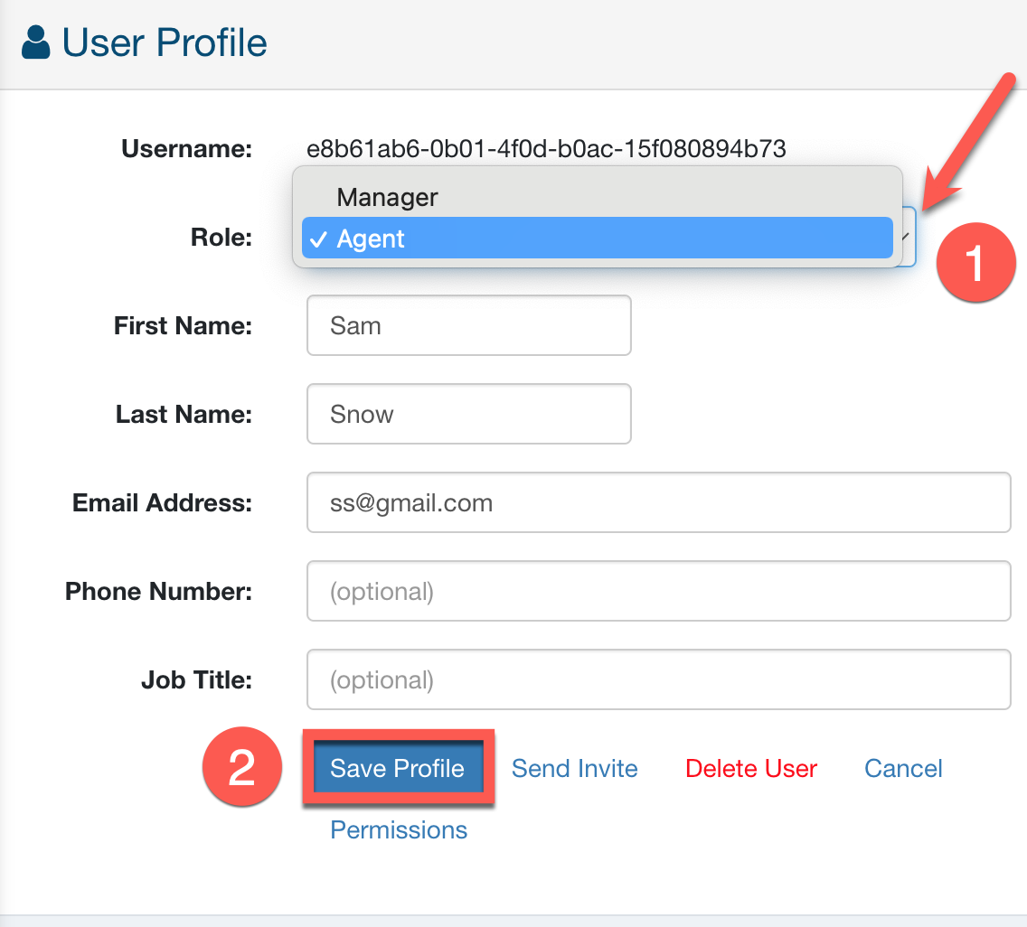 - Click the box beside 'Role' to open the dropdown menu and select the new role for the user.